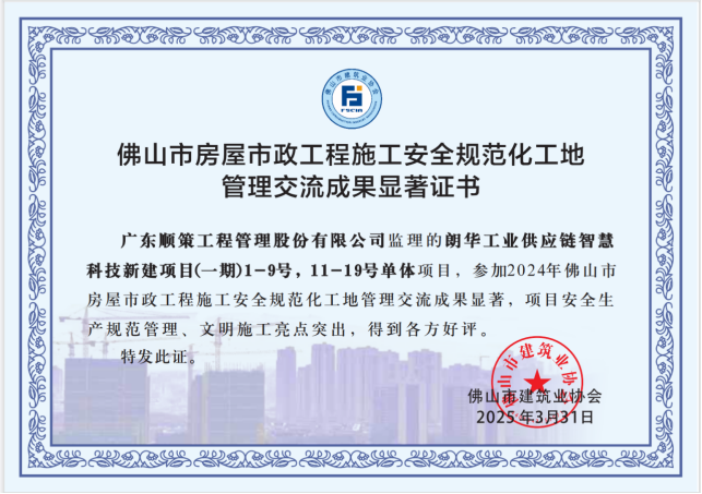 佛山市房屋市政工程施工安全规范化工地管理交流成果显著证书
