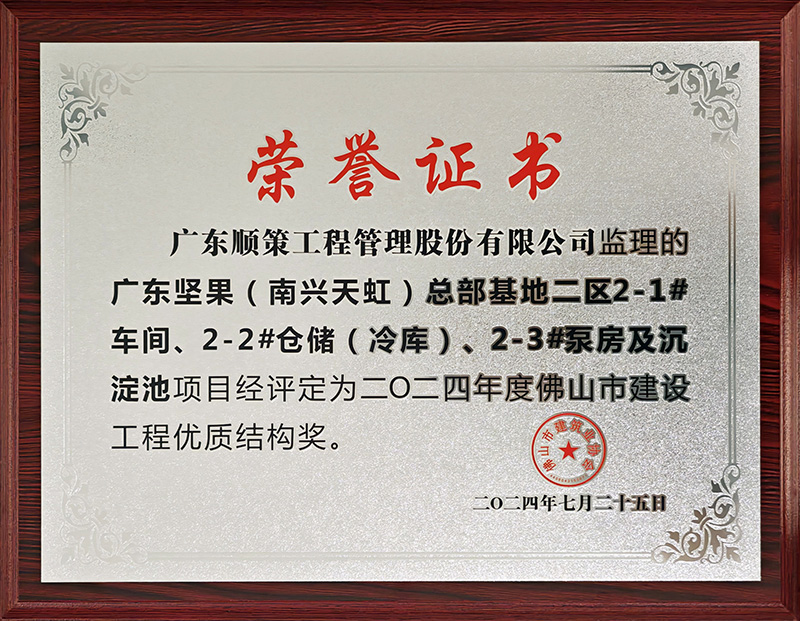 广东坚果(南兴天虹)总部基地二区2-1#车间、2-2#仓储(冷库、2-3#泵房及沉淀池项目或2024年度佛山市建设工程优质结构奖