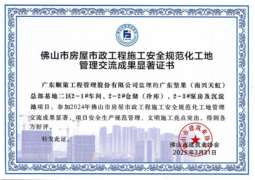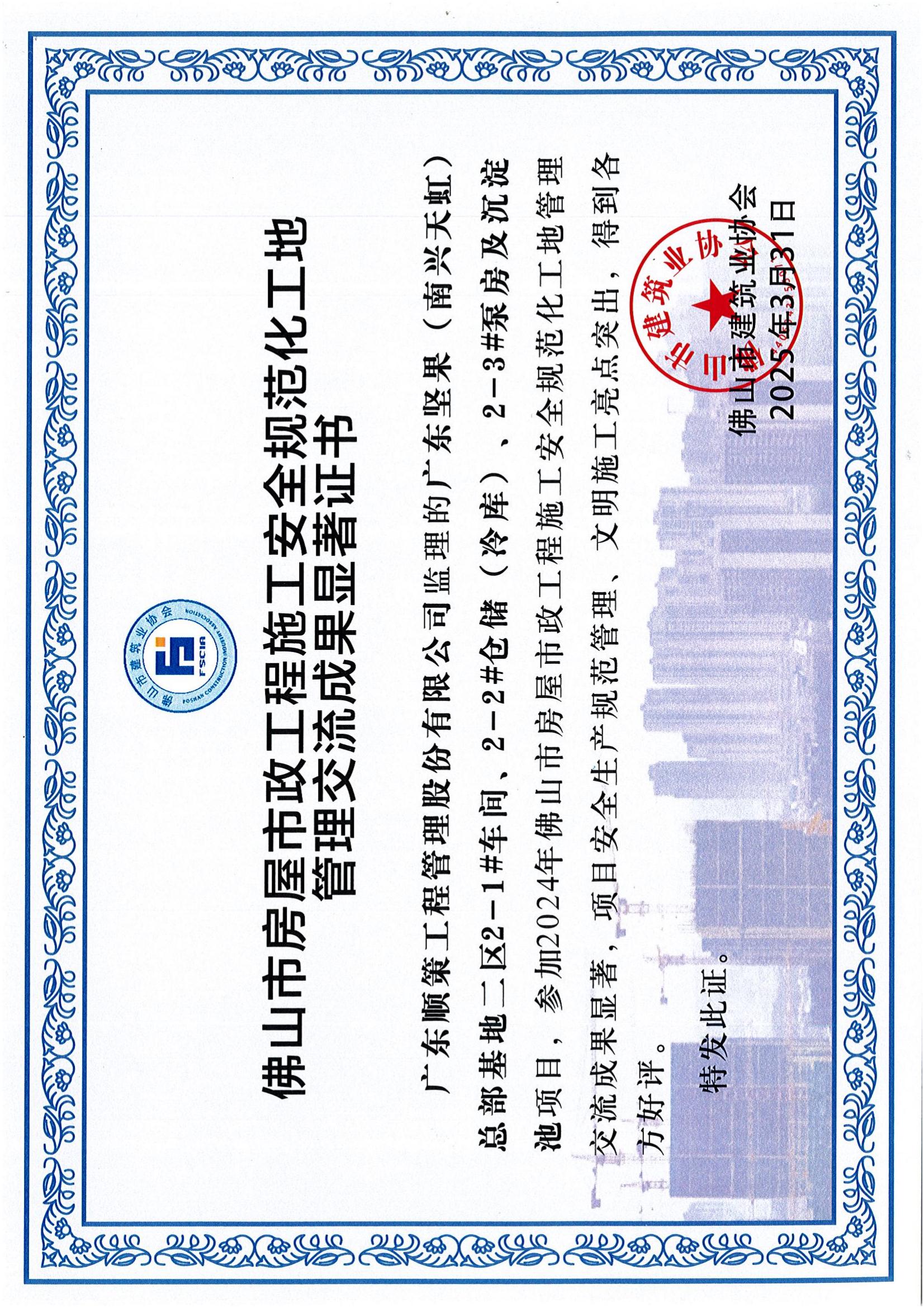 佛山市房屋市政工程施工安全规范工地管理交流成果显著证书