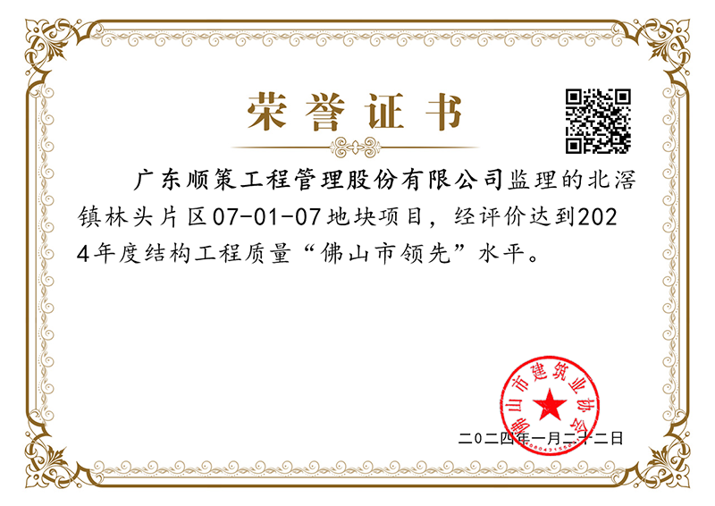 北滘镇林头片区07-01-07地块项目达2024年度结构工程质量“佛山市领先”水平