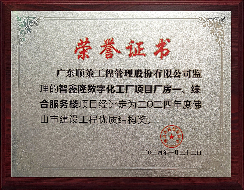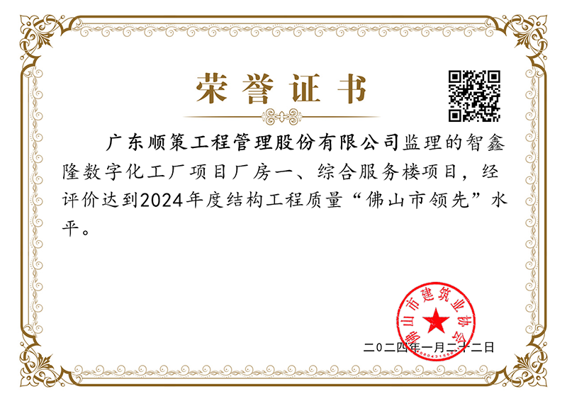 智鑫隆数字化工厂项目厂房一、综合服务楼项目达2024年度结构工程质量“佛山市领先”水平