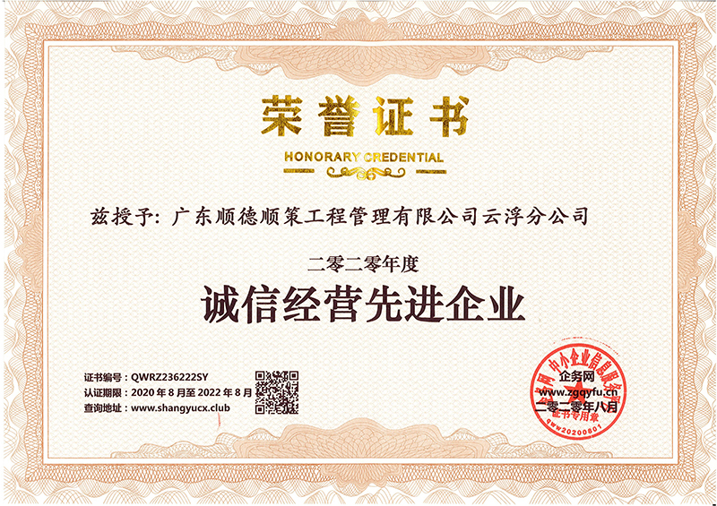 诚信经营先进企业荣誉证书(顺策云浮分公司)