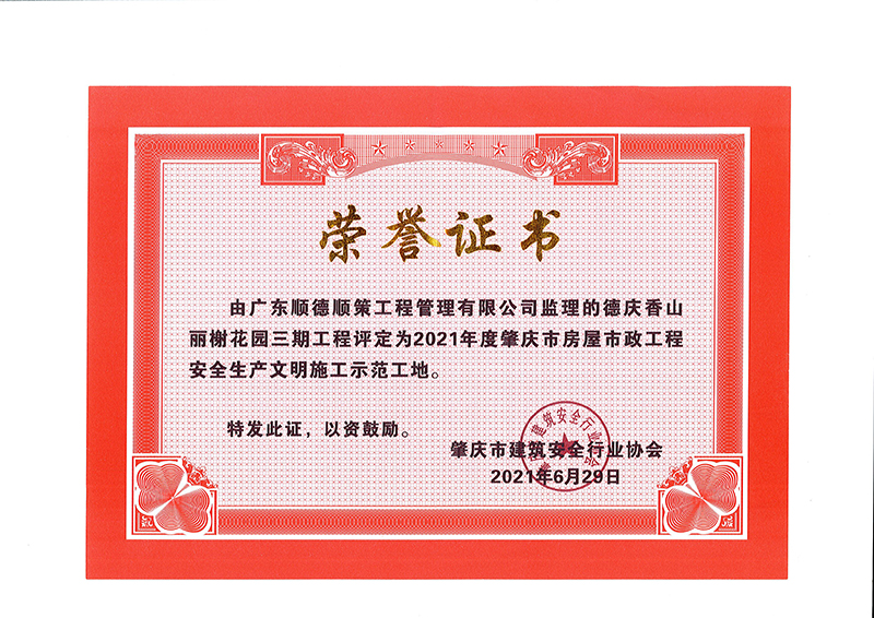 德庆香山丽榭花园三期工程评为2021年度肇庆是房屋市政工程安全生产文明施工示范工地